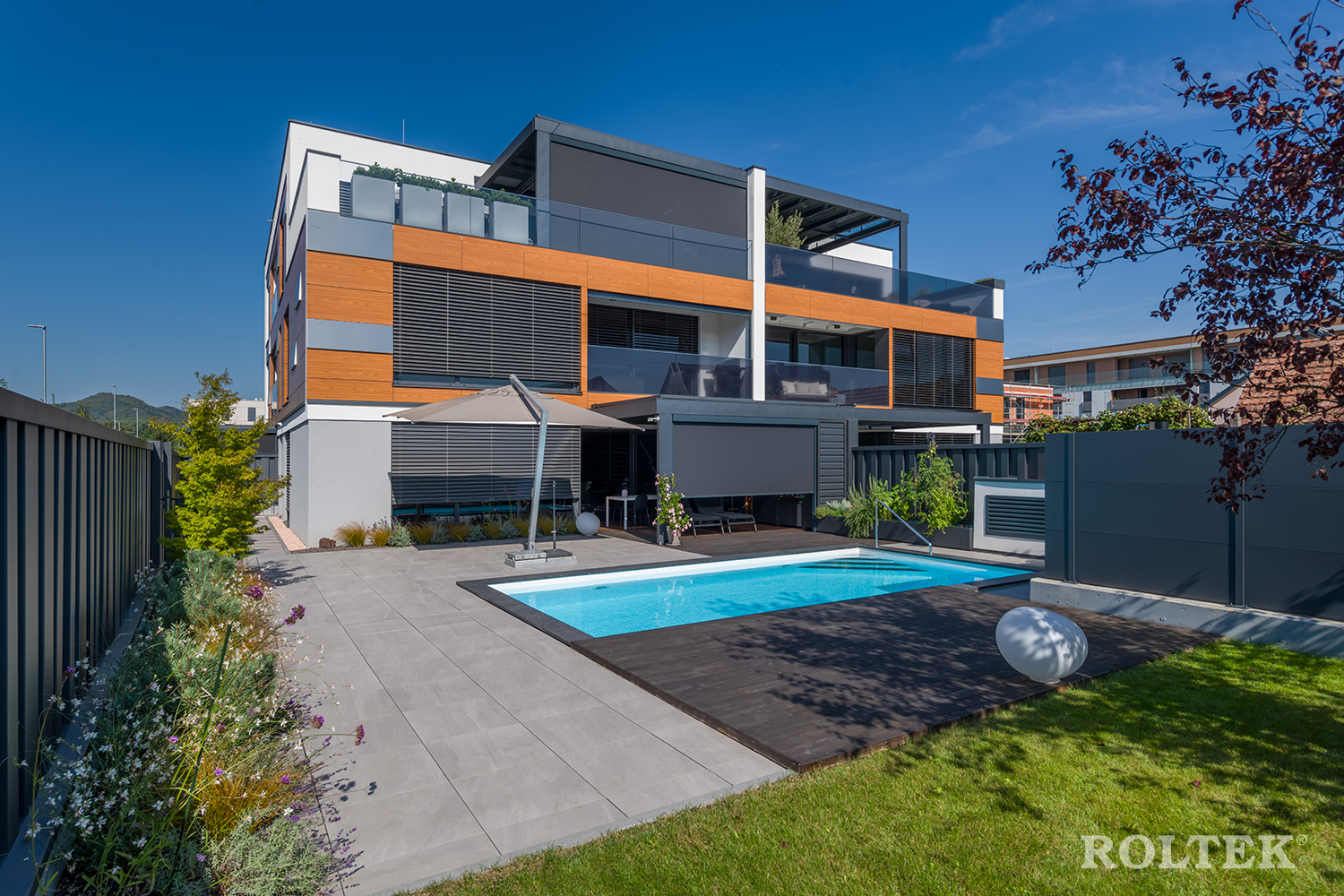 V bližini Maribora je zrasla nova vila z devetimi nadstandardnimi stanovanji. Pri njenem oblikovanju so imeli v mislih čim večjo odprtost na jug, kajti tam so najlepši pogledi. »Tako smo z velikimi steklenimi površinami poskusili pripeljati košček Pohorja in Pekrske gorce v dnevne sobe stanovanj,« so spregovorili arhitekti za Ambiente. Vendar se ob nepozabnem razgledu in velikih steklenih površinah postavlja tudi vprašanje, kako zagotoviti celovito zaščito pred soncem. Podjetje ROLTEK je odgovorilo na to vprašanje z uporabo kombinacije zunanjih žaluzij HERO, tend in zip screenov OLIMP.